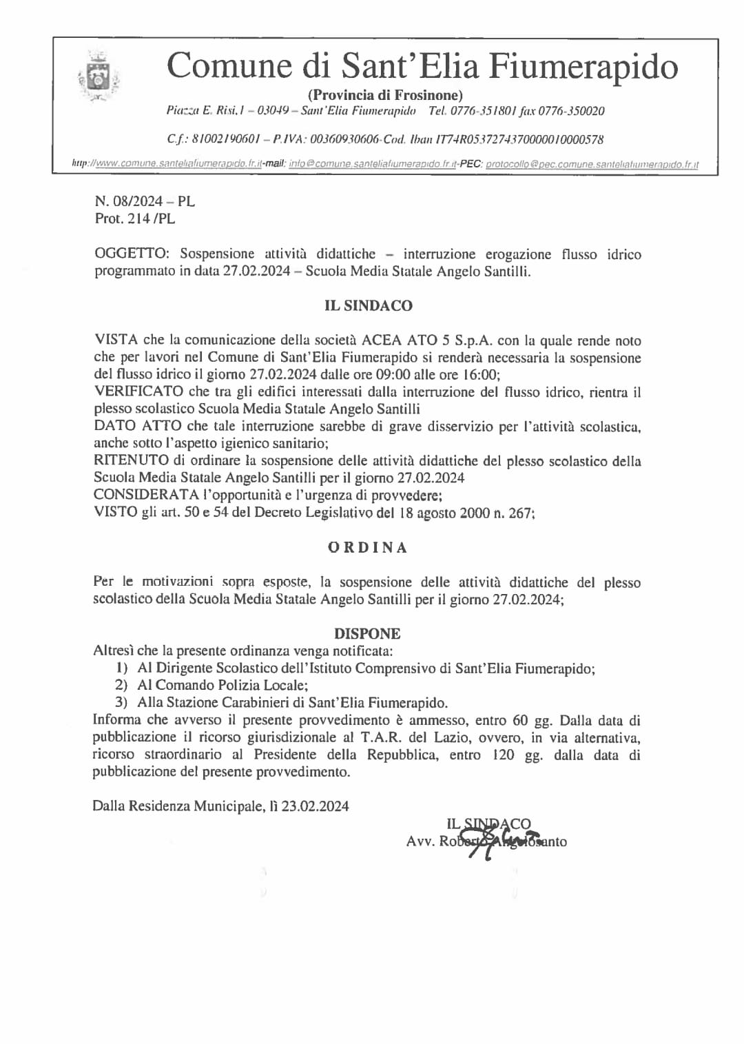 Le attività didattiche saranno sospese martedì 27/02/2024 per interruzione erogazione flusso idrico.